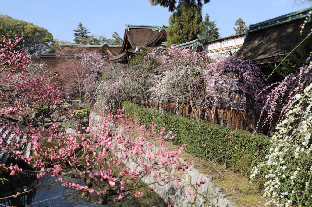 歴史ある社殿と梅の組み合わせは、京都らしい風情を感じられる絶景として人気があります。