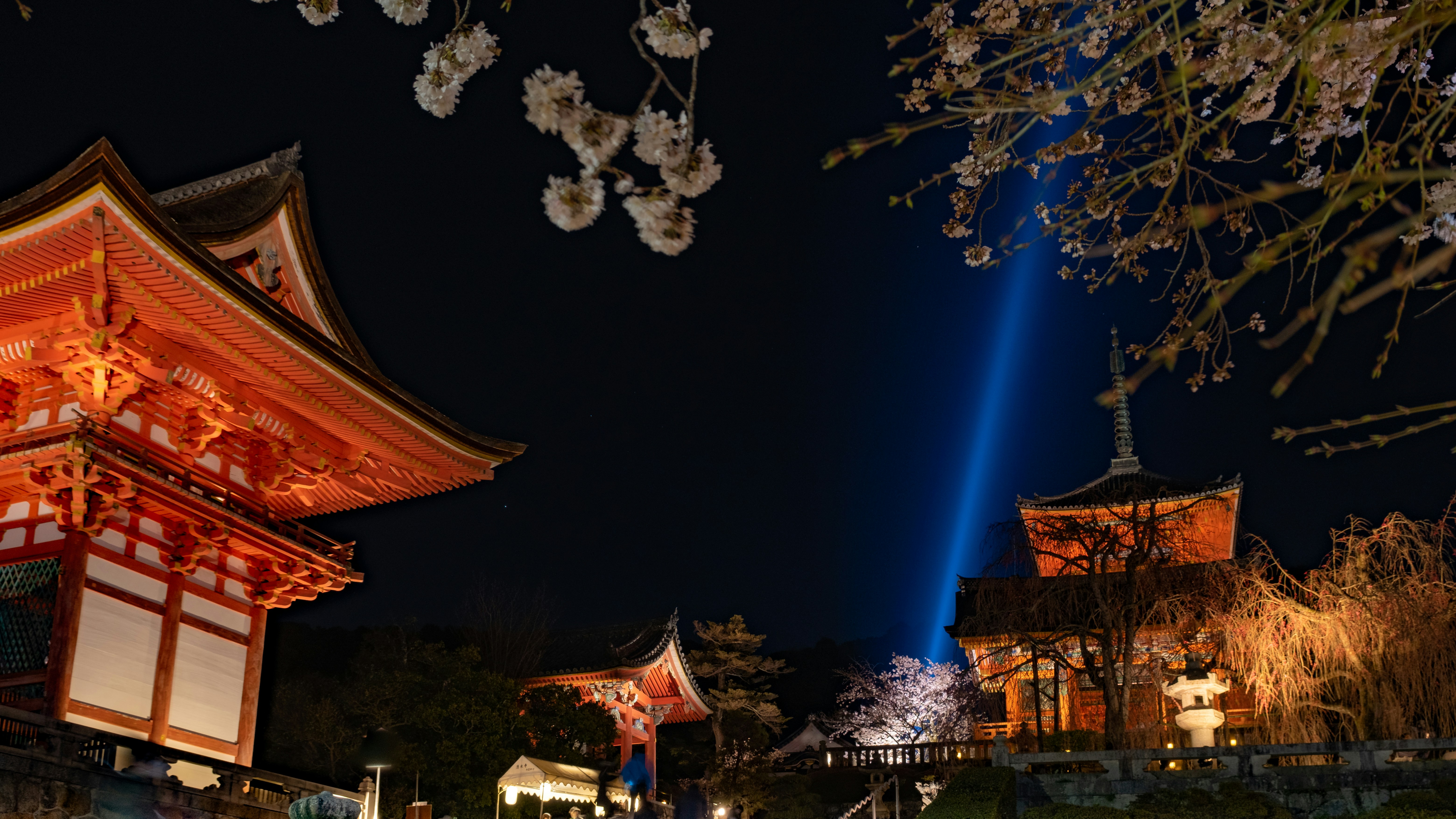 春の特別夜間拝観では、ライトアップされた桜と本堂の舞台が幻想的な景色を作り出します。