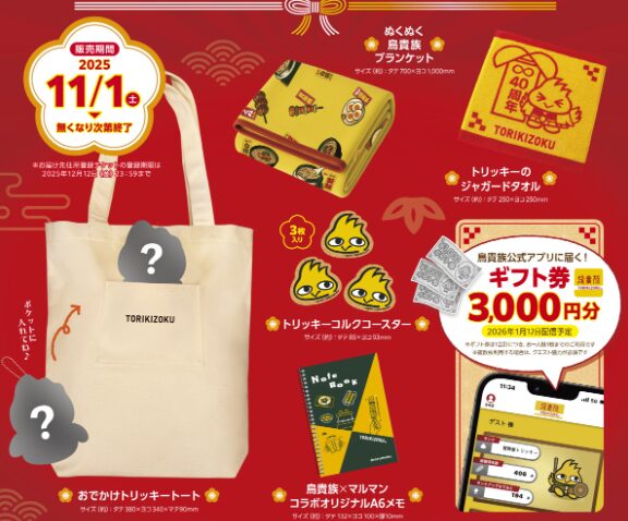 鳥貴族オリジナルグッズ5点に公式アプリのギフト券3,000円分がセットになったお得な福袋。